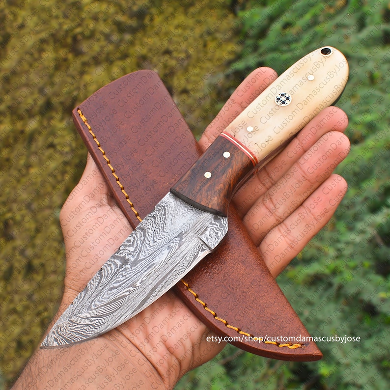 Introducing our handmade Damascus Skinner knife with a bone handle! This knife is a true work of art, both in terms of its craftsmanship and its functionality.