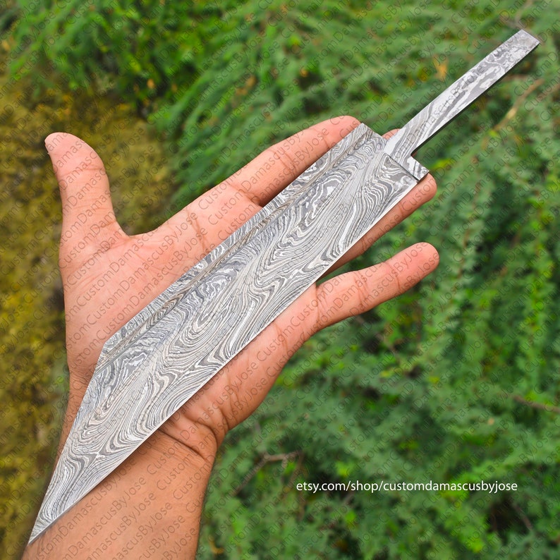 This Damascus Seax knife Blank blade is Handmade with 4mm (approx) thick 1095HC & 15n20 Damascus Steel with 5 folds 352 layers of Twist pattern having 56-58 HRC.This knife have full tang construction that runs across entire knife from made to handle that provides better balance and durability and easy to work for hobby or pro knife making / DIY Knife making.