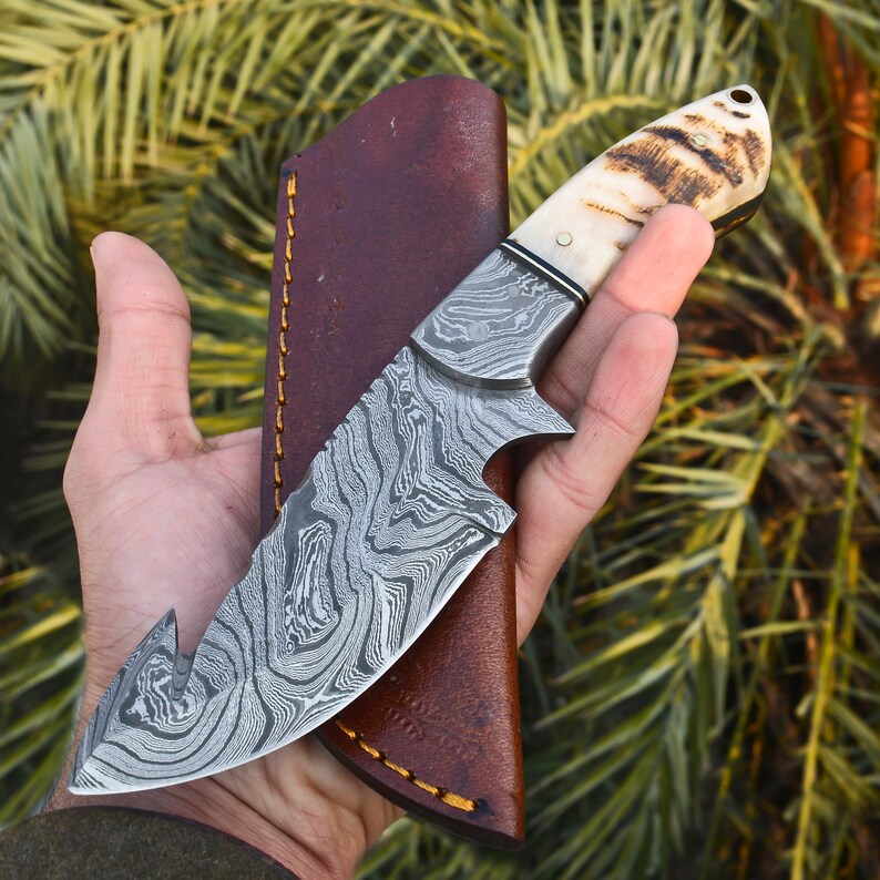 This Damascus Guthook knife is Handmade with 4.5mm (approx) thick 1095HC & 15n20 Damascus Steel with 5 folds 352 layers of Twist pattern having 56-58 HRC.Made of single piece of steel that runs across entire knife from made to handle that provides better balance and durability and great for your camping and hunting collection.