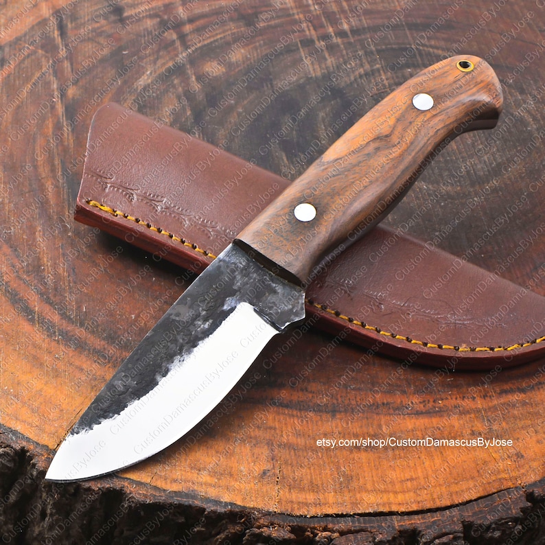 These handmade camping knife are perfect tool for any outdoor adventure. Crafted with precision and care, it features a durable 440c Stainless Steel that is sharp and strong. The handle is made from natural wood, providing a comfortable grip and giving it a rustic look. The knife also includes a leather sheath for safe and easy storage. This knife is perfect for camping, Bush crafting, hunting, fishing, and survival situations