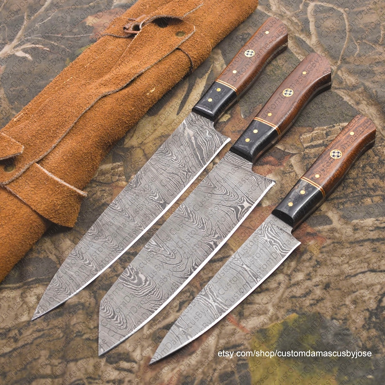 These Kitchen / Chef Knives are Handmade with 3mm (approx) thick 1095HC & 15n20 Damascus Steel with 5 folds 352 layers of Twist pattern having 56-58 HRC.with Full Tang construction that runs across entire knife from made to handle that provides better balance and durability and great for your Kitchen and Knife collection and a Perfect Gift for your Loved ones.